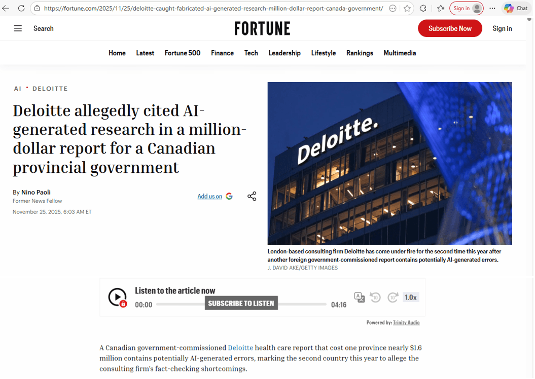 Deloitte returns part of $1.6M to Canadian Gov't Client due to AI Errors.